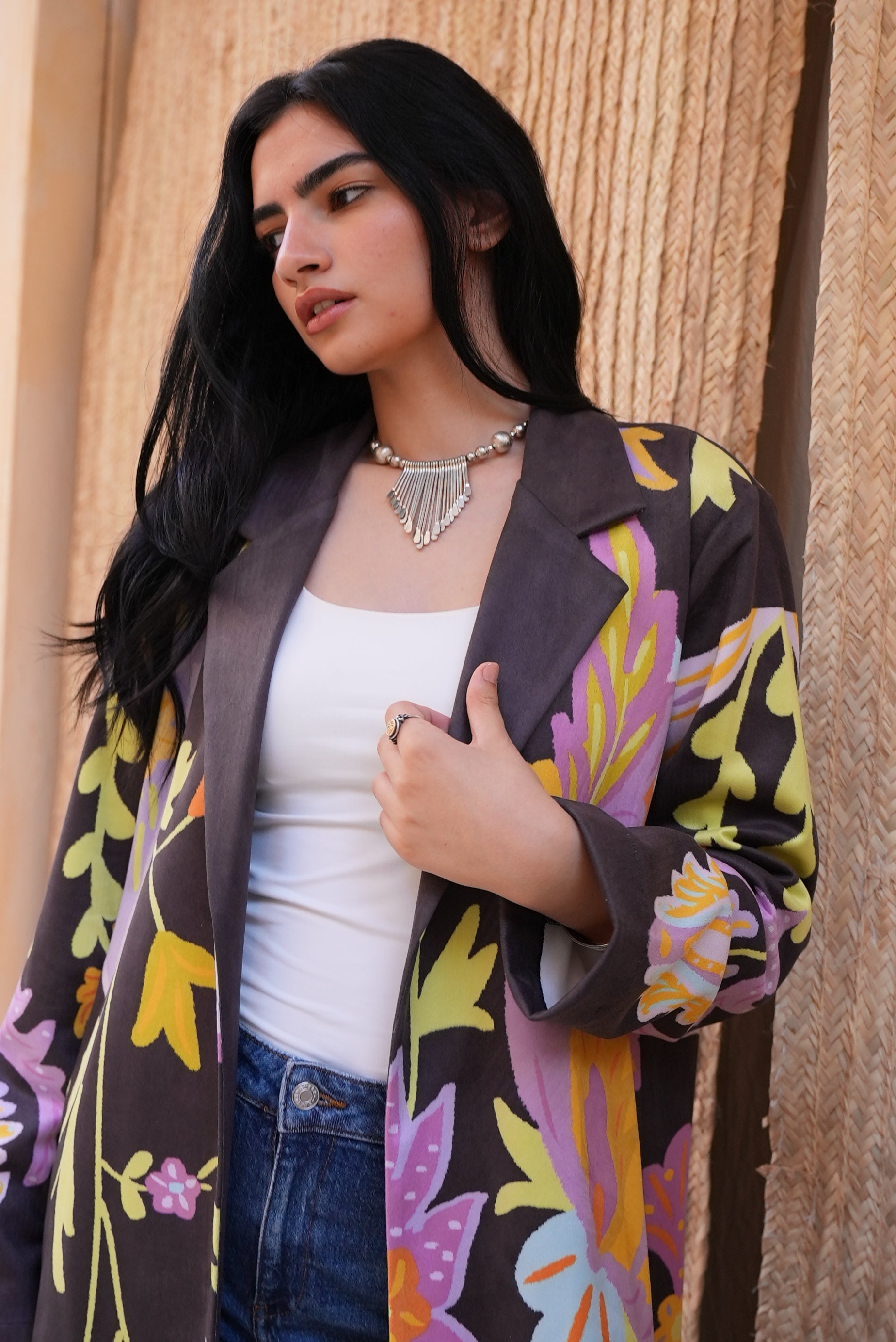 A bold, printed suede cardigan featuring a sharp, notched lapel and vibrant bohemian floral patterns .